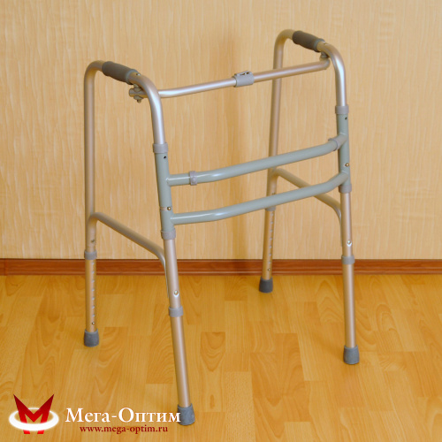 и усиленной двойной центральной рамы. Ходунки изготовлены из анодированных алюминиевых трубок, с лаковым защитным покрытием. Надежная фиксация в сложенном и разложенном виде обеспечивается кнопочными замками, простыми, удобными и безопасными в обращении. На боковых опорах установлены мягкие поручни. Высота опоры регулируется
