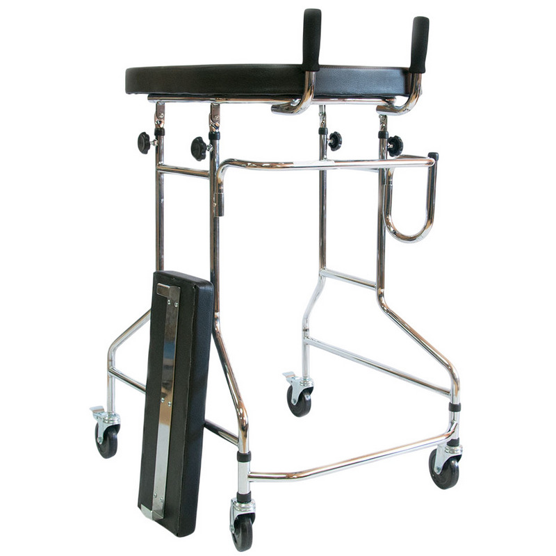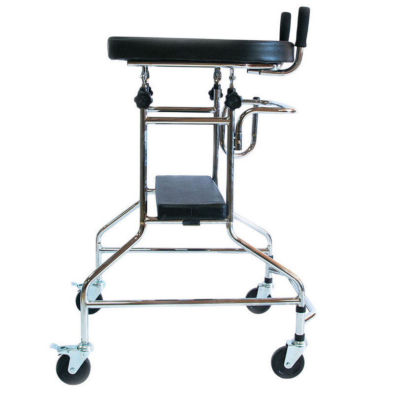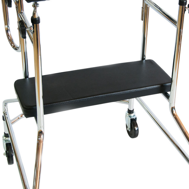 Конструкция ходунков разборная, выполнена из хромированной стали, сиденье и подлокотная опора – из искусственной кожи. Четыре колеса конструкции обеспечивают легкость передвижения без лишних усилий. Задние колеса оснащены стояночными тормозами.