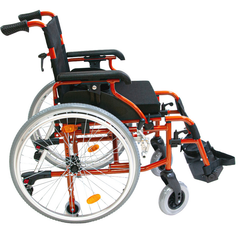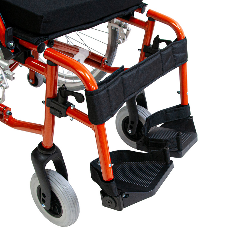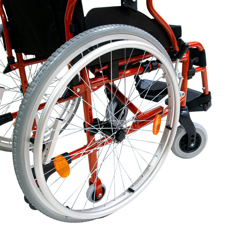 Задние колеса быстросъемные, пневматические/литые; оборудованы ободами для движения и светоотражателями (катафотами). Оси задних колес регулируются по вертикали и горизонтали. Передние колеса литые. Также коляска оборудована регулирующимися транзитными колесами для проезда через узкие проходы.