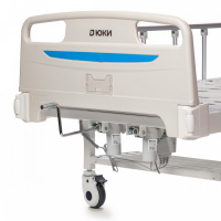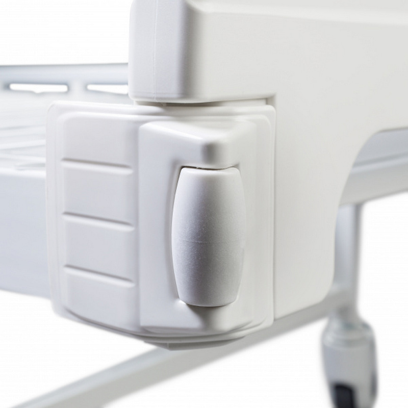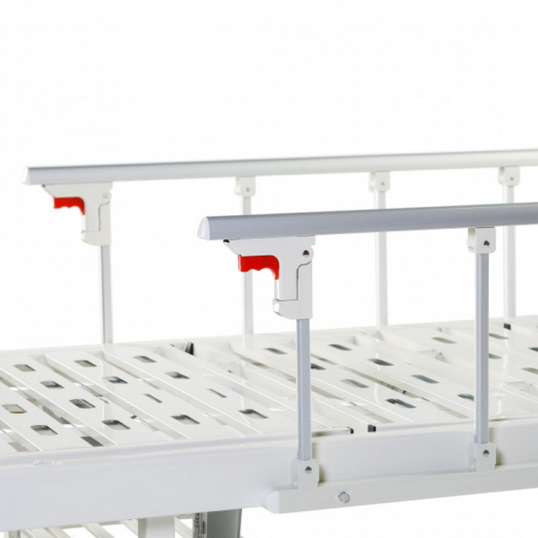 - Кровать оборудована двумя боковыми ограждениями - рейлингами с 6 вертикальными опорами, которые служат барьером, и по мере надобности могут подниматься и опускаться.