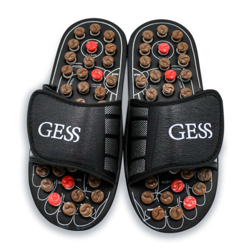 Массажер для стоп в виде тапочек для акупунктурного массажа, с регулируемой полнотой стопы. Массаж осуществляется пружинящими кнопками, которые при надавливании проворачиваются и массируют определённую точку. Акупунктурный массаж стоп очень полезен. Каждая точка на ноге соответствует определённому органу. После массажа стоп активизируется работа всех органов. Благодаря такому воздействию улучшается общее состояние организма, снимается отёчность и усталость ног. Такие тапочки препятствуют образованию солевых отложений и появлению натоптышей и шпор.