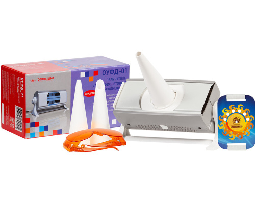 Аппарат ОУФд-01 имеет пластиковый корпус, комплектуется защитными очками, рассчитанными на детский размер, а также биодозиметром для определения индивидуальной биодозы с учетом физиологических особенностей пациента.