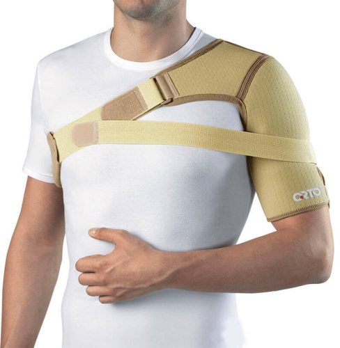 Бандаж из материалов аэропрен и Coolmax на плечевой сустав, снабжен фиксирующим ремнем со смягчающей муфтой.