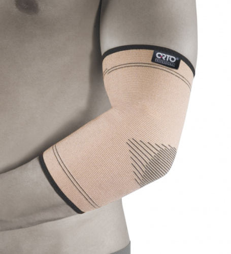 Эластичный бандаж на локтевой сустав с разреженной вязкой над локтем.