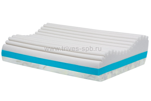 верхний слой с «эффектом памяти» и валиками различной высоты обеспечивает правильное положение головы и шеи, дарит ощущение невесомости, не препятствует воздухообмену