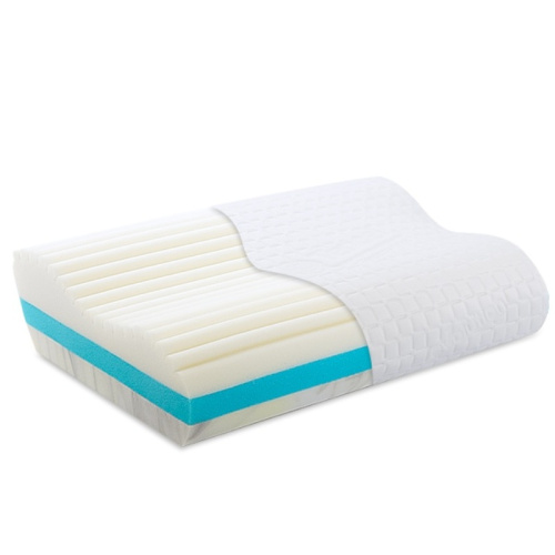 - верхний слой с «эффектом памяти» и валиками различной высоты обеспечивает правильное положение головы и шеи, дарит ощущение невесомости, не препятствует воздухообмену