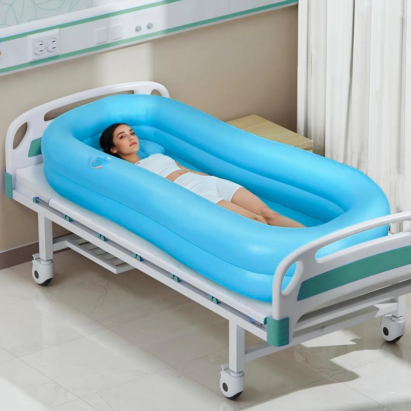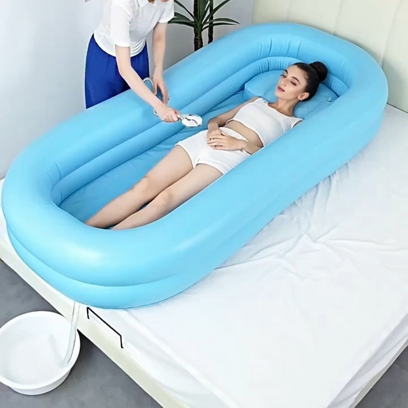 Ванна надувная используется для приема водных процедур больными с ограниченной подвижностью или постельным режимом. В сдутом состоянии ванна стелется на кровать под человеком и надувается с помощью электронасоса, поставляющегося в комплекте вместе с ванной. После использования ванну также легко сдуть с помощью электронасоса. В комплект с ванной входят: электронасос, сливной шланг, шланг с душевой насадкой, ремонтный набор, надувная подушка.